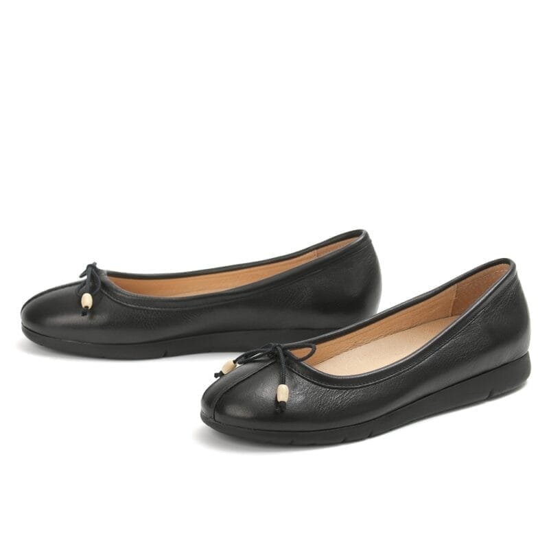 El modelo MIRA es una bailarina clásica con lazo decorativo y costuras ornamentales, fabricada en piel de becerro de alta calidad.